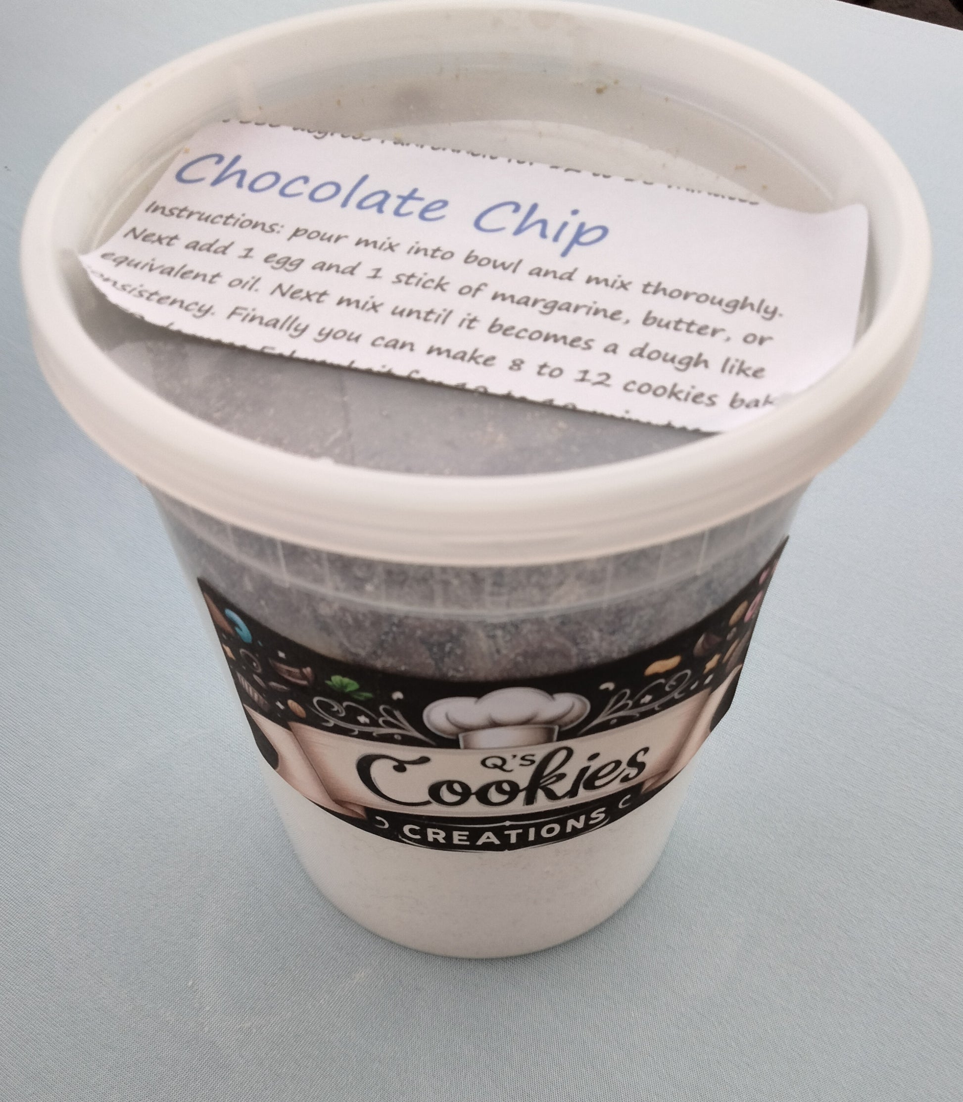 Q's famous Dry Mix Gourmet Cookies! just add an egg and a stick of margarine/ butter or 1/2 cup of oil!