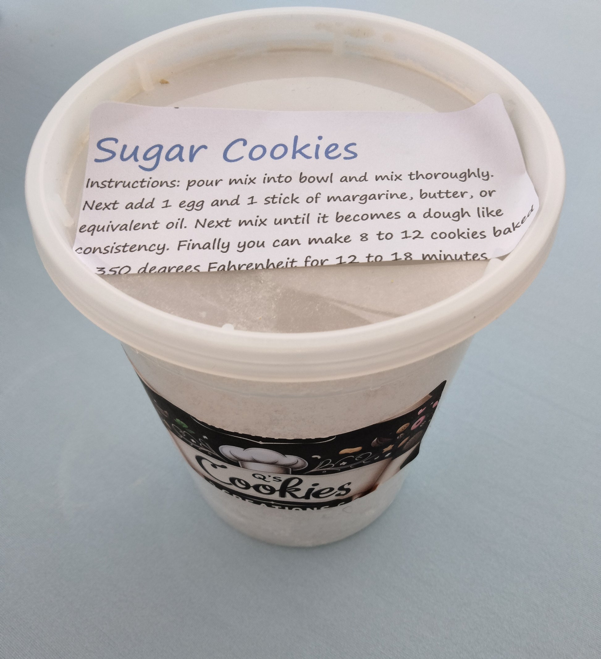 Q's famous Dry Mix Gourmet Cookies! just add an egg and a stick of margarine/ butter or 1/2 cup of oil!